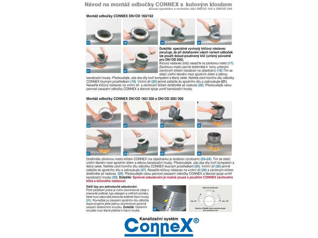 Pomocí CONNEX-odbočky můžeme do hlavní stoky snadno a lehce přiipojit domovní vedení či vedlejší přiítoky, ať už nově budovaných sítí či při dodatečném napojování. Nyní je odbočka vylepšena navíc kulovým kloubem, který umožňuje výkyv napojovaných trub v rozmezí 0° až 11°. Tím odbočka CONNEX splňuje požadavky dle ATVDVWK-A139, kde »kanalizační přípojky mají být vyrobeny a napojeny tak, aby mohly reagovat na pohyby zeminy.« Zvýšena flexibilita takto napojených přípojek zajišťuje jejich dlouhou životnost a vysokou kvalitu.